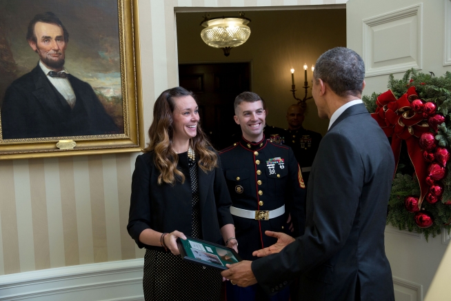 President Barack Obama receives a framed copy of the Marine Helicopter Squadron One (HMX-1) Christmas holiday greeting card from Erin Strohschein and Gunnery Sergeant Christopher Strohschein in the Oval Office, Dec. 8, 2015. (Official White House Photo by Lawrence Jackson)