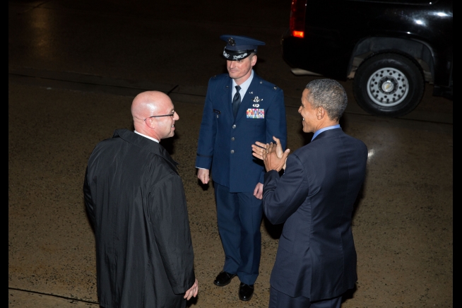 President Barack Obama applauds Robert Buster, United States Secret Service Special-Agent-in-Charge, at Joint Base Andrews after returning from France on his last trip aboard Air Force One, Dec. 1, 2015. Agent Buster, the head of the President's detail, will be moving to a position at USSS headquarters later this month. (Official White House Photo by Pete Souza)