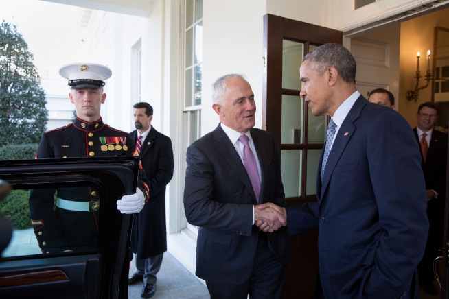 President Barack Obama says goodbye to Prime Minister Malcolm Turnbull of Australia at the entrance to the West Wing Lobby of the White House, following their working lunch, Jan. 19, 2016. (Official White House Photo by Pete Souza)