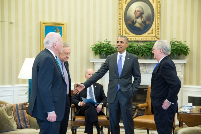 President Barack Obama talks with, from left, Sen. Patrick Leahy, D-Vt., Senate Democratic Leader Harry Reid, D-Nev., and Senate Majority Leader Mitch McConnell, R-Ky., at the conclusion of a meeting with the leadership of the Senate Judiciary Committee in the Oval Office, March 1, 2016. The President, with Vice President Joe Biden, met with the committee members, including Sen. Chuck Grassley, R-Iowa, to discuss topics including the Supreme Court vacancy left by the death of Justice Antonin Scalia, opioid legislation and criminal justice reform. (Official White House Photo by Pete Souza)