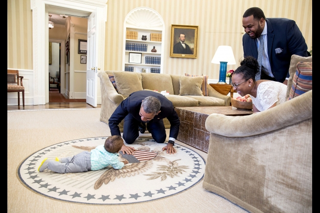 President Barack Obama plays with August DuBois during an Oval Office visit with his parents, Joshua and Michelle DuBois, April 11, 2016. Joshua is the former Executive Director of the White House Office of Faith-based and Neighborhood Partnerships. (Official White House Photo by Pete Souza)