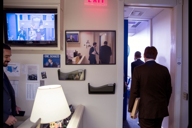 President Barack Obama enters the James S. Brady Press Briefing Room from the White House Press Office prior to making a statement on the economy, May 6, 2016. (Official White House Photo by Pete Souza)