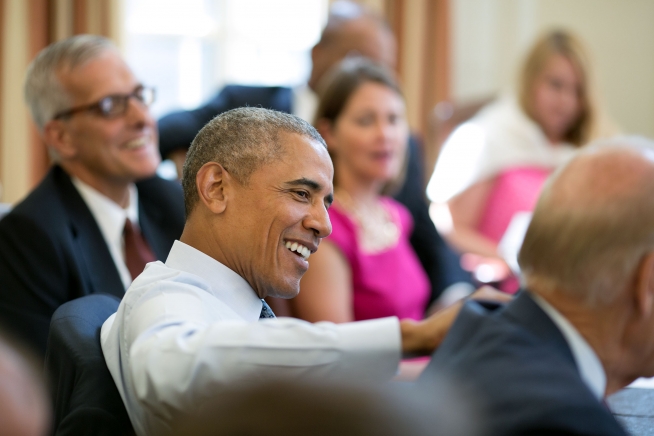 President Obama, with his hand on the shoulder of Vice President Joe Biden, reacts during a meeting with senior advisors at the White House, Aug. 29, 2016. (Official White House Photo by Pete Souza)