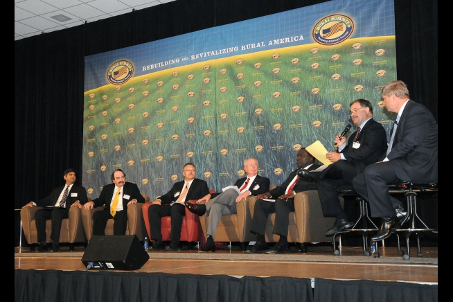 A Dialogue on Rural America was the first discussion panel held at the National Rural Summit. (Panelists L to R Chief Technology Officer and Assistant to the President Aneesh Chopra, President of Show Me Energy Steve Flick, President of National Corn Growers Association Darrin Ihnen, Past President of National Association of Conservation Districts John Redding, Mayor of Philadelphia, Mississippi James Young, Agriculture Broadcaster at WGN radio Max Armstrong, and Agriculture Secretary Tom Vilsack).