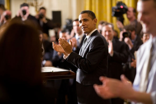 President Barack Obama joins in a standing ovation at the introduction of Senator Edward M. Kennedy, D-Mass., during the Health Care Summit second session Thursday, March 5, 2009, in the East Room at the White House.