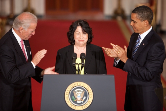 President Barack Obama and Vice President Joe Biden applaud as Judge Sonia Sotomayor delivers remarks in the East Room of the White House in Washington, May 26, 2009.