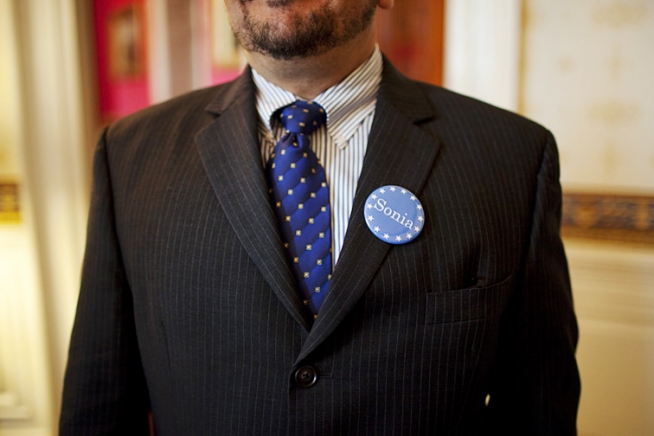 A supporter wears a Sonia button during a confirmation reception for Justice Sonia Sotomayor in the East Room of the White House August 12, 2009.