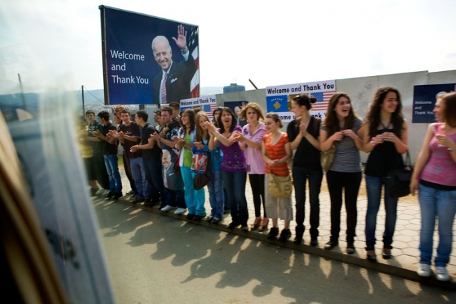 Cheering young people line the route of Vice President Joe Biden's motorcade into downtown Pristina, Kosovo, Thursday, May 21, 2009.