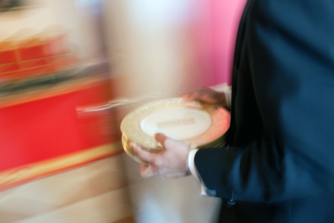 A White House butler carries plates into the Blue Room of the White House for a Congressional spouses luncheon hosted by First Lady Michelle Obama
