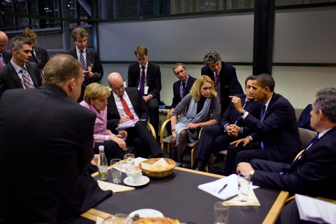 President Barack Obama briefs European leaders following a multilateral meeting at the United Nations Climate Change Conference in Copenhagen, Denmark. Participants include British Prime Minister Gordon Brown, French President Nicolas Sarkozy, Danish Prime Minister Lars L. Rasmussen, Swedish Prime Minister Fredrik Reinfeldt, and German Chancellor Angela Merkel