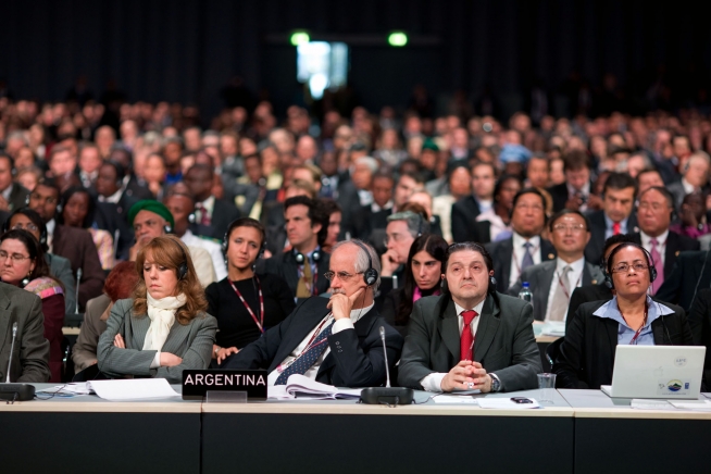Delegates listen as President Barack Obama delivers remarks during a morning plenary session of the United Nations Climate Change Conference in Copenhagen, Denmark