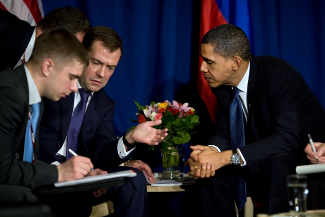 President Barack Obama participates in a bilateral meeting with Russian President Dmitry Medvedev during the United Nations Climate Change Conference at the Bella Center in Copenhagen, Denmark