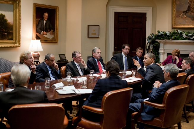 President Barack Obama speaks during a meeting with members of the financial industry to discuss economic recovery, small business lending, improving lending practices for homeowners and the Administration's plans for financial reform, during a meeting in the Roosevelt Room of the White House, Dec. 14, 2009. (Official White House Photo by Pete Souza)