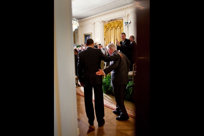 President Barack Obama and Sen. Ted Kennedy enter the East Room of the White House to attend the second session of a Health Care Summit with members of Congress March 5, 2009.