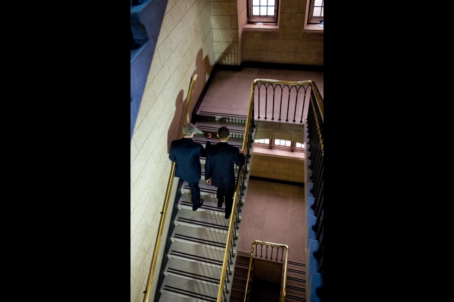 President Obama and Canadian Prime Minister Stephen Harper walk up a staircase at the Parliament in Ottawa, Canada on Feb. 19, 2009.