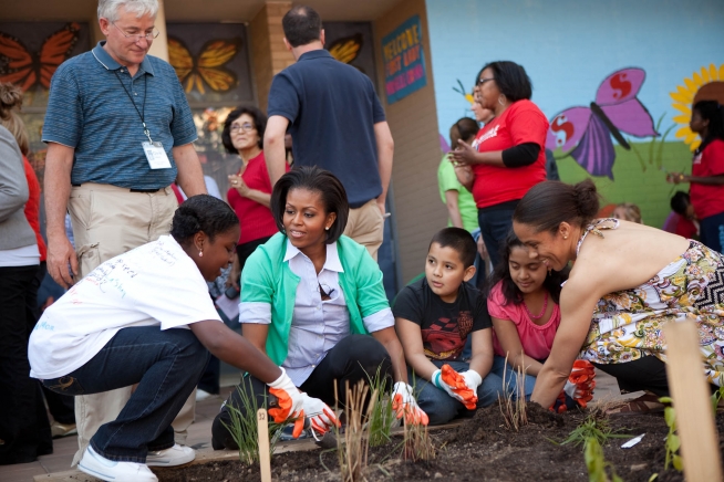 First Lady Michelle Obama talks with other volunteers while planting a garden while visiting the Marie Reed Community Learning Center in Washington, DC,