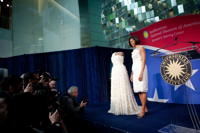 First Lady Michelle Obama presents her 2009 inaugural gown to the Smithsonian National Museum of American History in Washington, D.C.