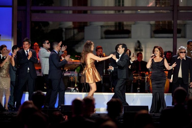 Marc Anthony dances with wife Jennifer Lopez as Gloria Estefan sings at the conclusion of "In Performance at the White House: Fiesta Latina," a concert celebrating Hispanic musical heritage held on the South Lawn.