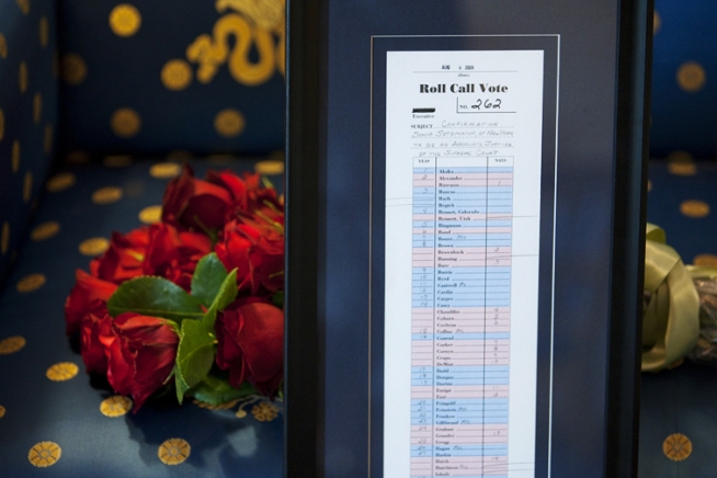 Senator Leahy presents Justice Sotomayor with the framed final vote tally from the Senate vote confirming her to the Supreme Court at the White House, August 12, 2009.