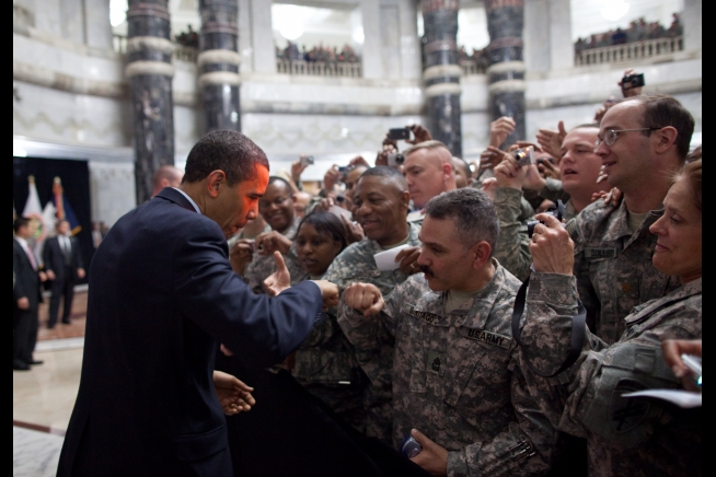 April 7, 2009 “President Obama fist-bumps a U.S. soldier at Camp Victory in Baghdad. The President was treated to an overwhelming reception by the troops.”