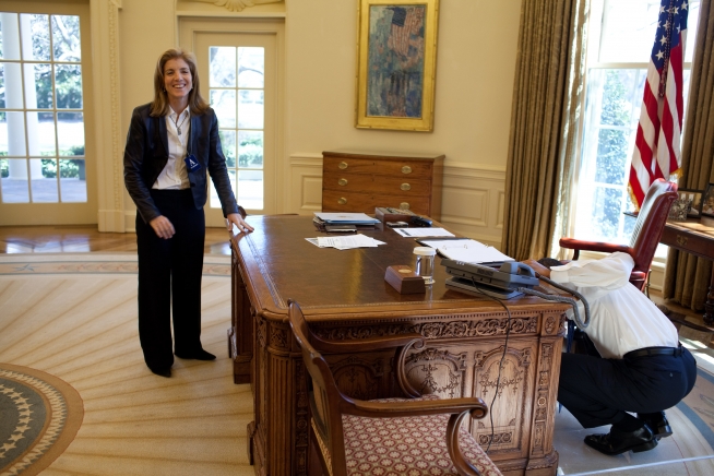 “To appreciate this photograph, one must know the iconic photograph by Stanley Tretick of John Kennedy Jr. crawling out from the trap door of this same desk while his father, President Kennedy, worked at the desk. Caroline Kennedy had stopped by to see President Obama, and when she mentioned that he was using the same desk as her father, the President immediately remembered the Tretick picture and tried to open the trap door. It was locked and no one had a key.”