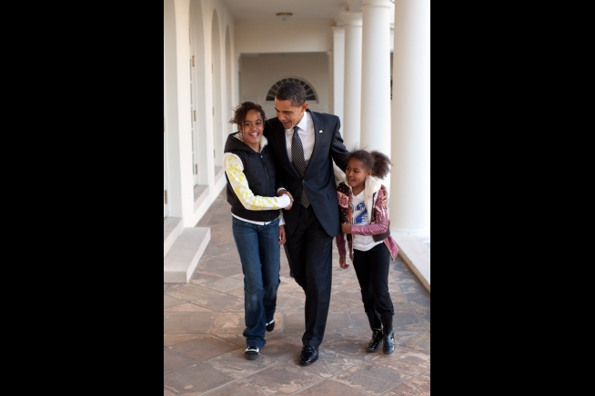 March 5, 2009 “The President was walking back to the Oval Office when he encountered his daughters, Malia and Sasha, after they had returned home from school.”