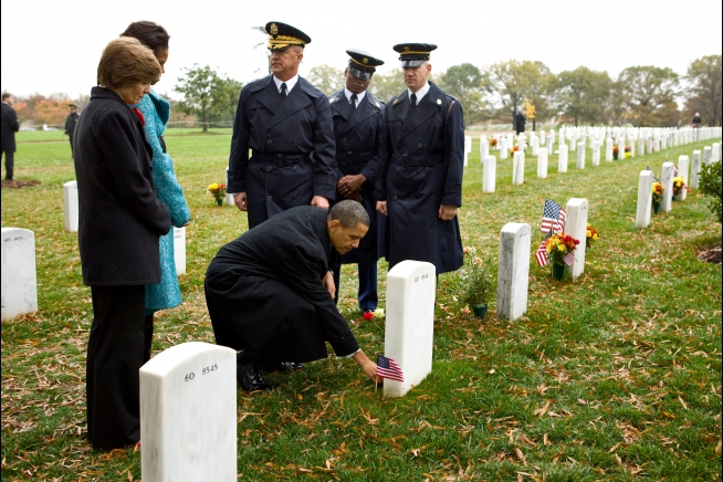 “He was at Arlington National Cemetery for Veterans Day, and after his remarks, made an impromptu stop at Section 60, where troops from Afghanistan and Iraq are buried. He paused to leave a Presidential coin in front of the tombstone for 19-year-old Medal of Honor recipient Specialist Ross McGinnis. Later that same day, the President held a briefing in the Situation Room on Afghanistan.”