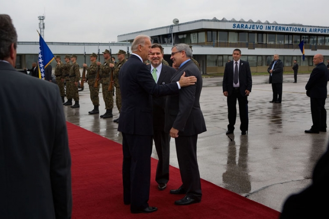 Vice President Joe Biden says goodbye at the Sarajevo International Airport before departing on AF2, in Sarajevo, Bosnia & Herzegovina, Wednesday, May 20, 2009.