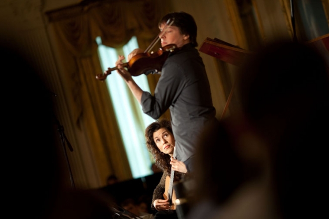 Guitarist Sharon Isbin and violinist Joshua Bell perform during the classical music series workshop in the East Room of the White House.