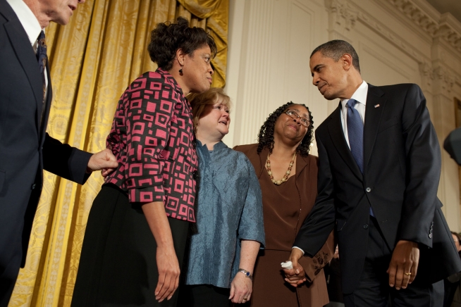 President Barack Obama greets Louvon Harris, left, Betty Byrd Boatner, right, both sisters of James Byrd, Jr., and Judy Shepard, center, mother of Matthew Shepard, following his remarks on the the Matthew Shepard and James Byrd, Jr. Hate Crimes Prevention Act in the East Room of the White House, Oct. 28, 2009.