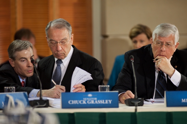 An aide writes a note to Sen. Charles Grassley (R-Iowa) as he and Sen. Mike Enzi (R-Wyo.), right, take part in the meeting to discuss health insurance reform legislation at Blair House in Washington, D.C., Feb. 25, 2010. (Official White House Photo by Pete Souza)