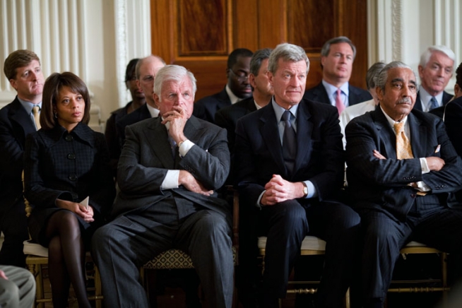 Sen. Ted Kennedy, along with White House Domestic Policy Council Director Melody Barnes, left, Sen. Max Baucus (D-MT), second from right, and Rep. Charles Rangel (D-NY) listen during a Health Care Summit second session in the East Room of the White House March 5, 2009. Sen. Kennedy's son, Rep. Patrick Kennedy (D-RI), is seated in second row at left.
