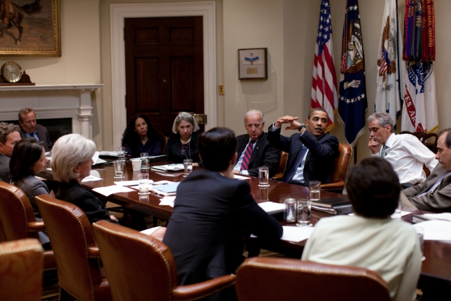 President Barack Obama discusses health care during a briefing with staff in the Roosevelt Room of the White House, June 18, 2009. (Official White House Photo by Pete Souza)