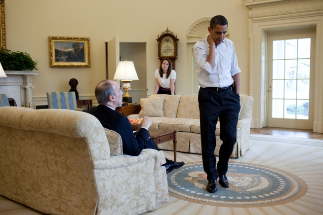 President Barack Obama President Barack listens to Phil Schiliro, assistant to the President for Legislative Affairs, during a meeting on health care in the Oval Office, March 21, 2010. Katie Johnson, the President's personal secretary, stands in the background. (Official White House Photo by Pete Souza)