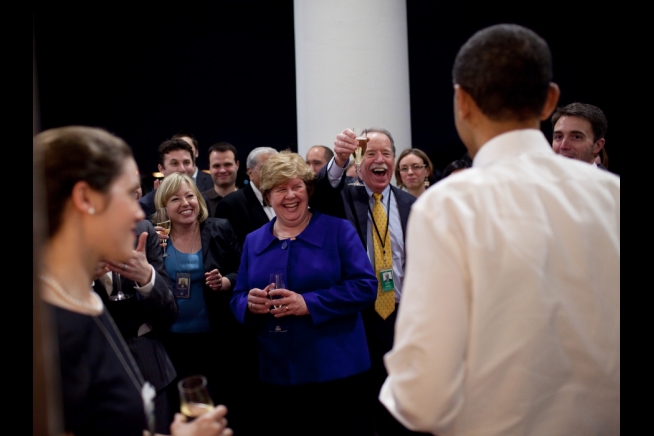President Barack Obama celebrates with staff on the Truman Balcony of the White House, early March 22, 2010, following the House vote to pass health care reform. (Official White House Photo by Pete Souza)