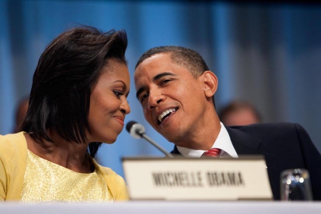 President Barack Obama leans in to speak with First Lady Michelle Obama at the International Olympic Committee session in Copenhagen, Friday, Oct. 2, 2009.