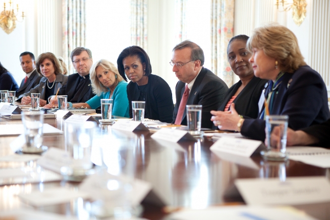 First Lady Michelle Obama and Dr. Jill Biden meet with Leadership 18 members in the State Dining Room of the White House,