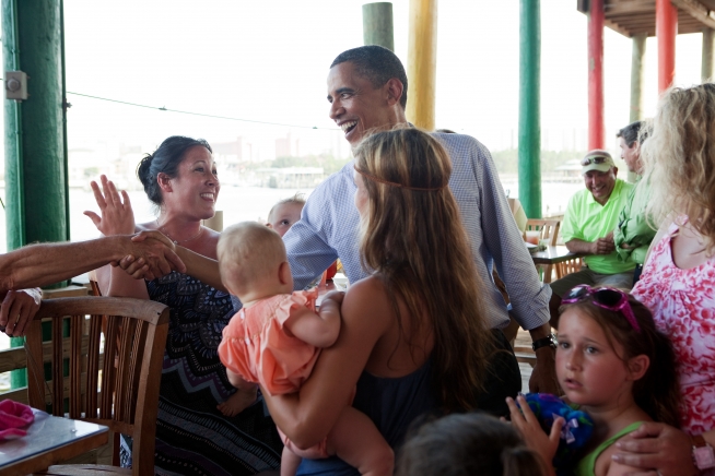 President Barack Obama talks with patrons during a stop at Tacky Jack's, a seafood restaurant in Orange Beach, Ala., June 14, 2010. (Official White House Photo by Pete Souza)