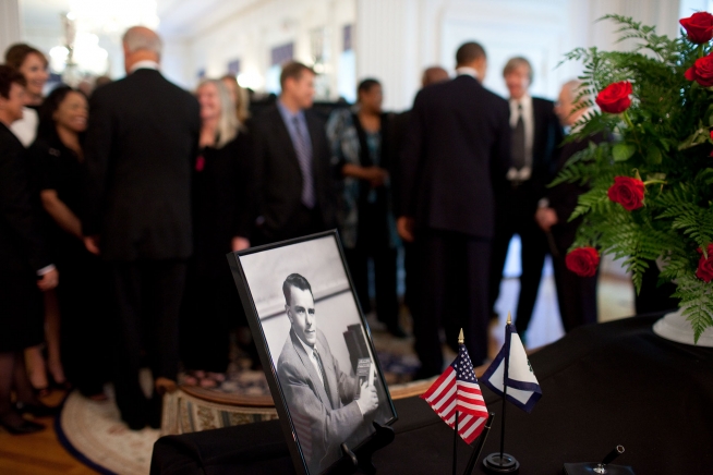 A photograph of Sen. Robert Byrd rests on a table at the West Virginia State Capitol in Charleston, W.Va., July 2, 2010, as President Barack Obama and Vice President Joe Biden greet members of the late Senator's staff before a memorial service celebrating Byrd's life. (Official White House Photo by Pete Souza)