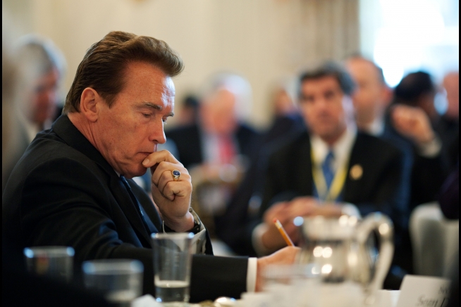 California Gov. Arnold Schwarzenegger takes notes during President Barack Obama's remarks to the National Governors Association meeting in the State Dining Room of the White House, Feb. 22, 2010. (Official White House Photo by Pete Souza)
