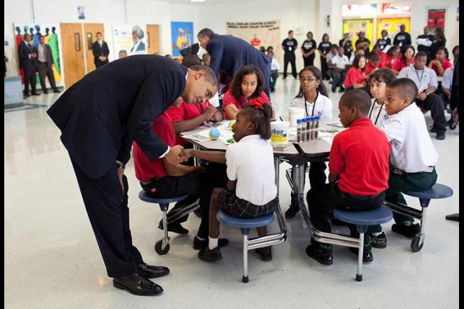President Barack Obama talks with students during a visit to the Dr. Martin Luther King Charter School in the Lower 9th Ward of New Orleans, La., Oct. 15, 2009.