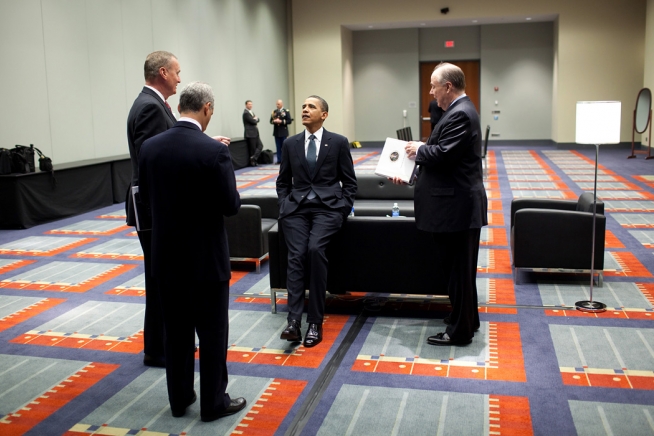 President Barack Obama meets with, from left, National Security Advisor Gen. James Jones, Chief of Staff Rahm Emanuel, and Deputy National Security Advisor Tom Donilon, during the Nuclear Security Summit at the Walter E. Washington Convention Center in Washington, D.C.,