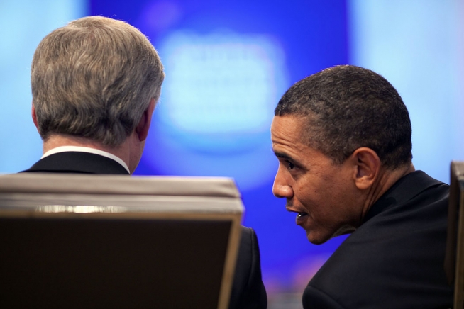President Barack Obama talks with Prime Minister Stephen Harper of Canada, during the second plenary session at the Nuclear Security Summit at the Walter E. Washington Convention Center in Washington, D.C.,