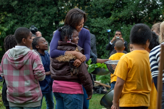 Photo of the Day October 30, 2009. First Lady Michelle Obama joins kids from the Bancroft Elementary School and staff from Miriam's Kitchen to help harvest vegetables from the White House Kitchen Garden.