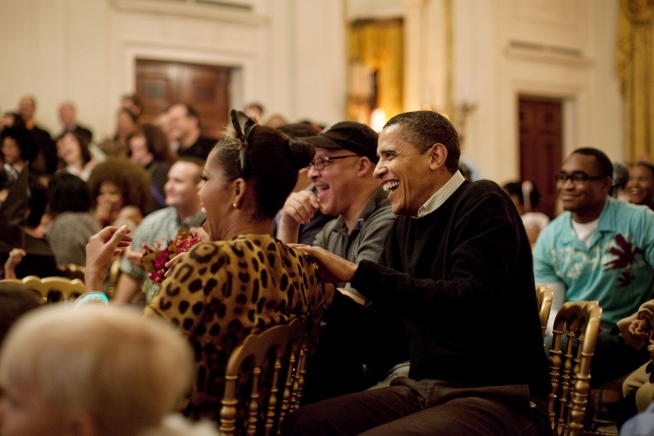 President Barack Obama and First Lady Michelle Obama react to performers during a Halloween reception for military families and children of White House and Residence staff in the East Room of the White House, Oct. 31, 2009.