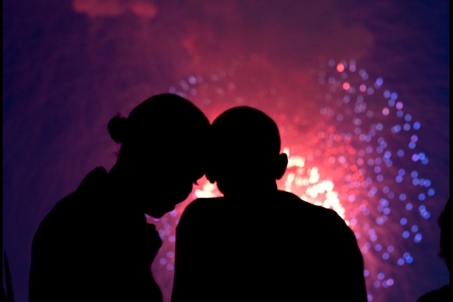 President Barack Obama and First Lady Michelle Obama watch the fireworks over the National Mall from the roof of the White House.