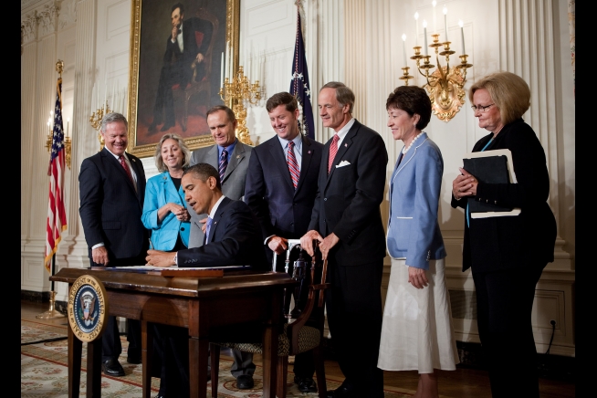 President Barack Obama signs the Improper Payments Elimination and Recovery Act in the State Dining Room of the White House in Washington, July 22, 2010. Watching, from left are; Rep. Charlie Wilson, D-Ohio, Rep. Dina Titus, D-Nev., Rep. Brian Bilbray, Calif., Rep. Patrick Murphy, D-Pa., Sen. Tom Carper, D-Del., Sen. Susan Collins, R-Maine, and Sen. Claire McCaskill, D-Mo.