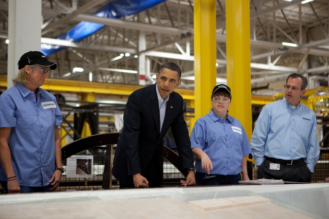 President Barack Obama tours the Siemens Wind Turbine Blade Manufacturing Plant in Fort Madison, Ia.,