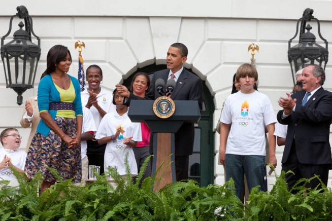 President Barack Obama delivers remarks during a U.S. Olympians youth sporting event on the South Lawn of the White House in Washington, Sept. 16, 2009. The event, which included fencing, gymnastics and judo demonstrations, helped promote Chicago's bid for the 2016 Summer Olympics.