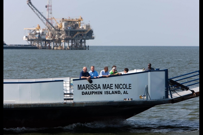 President Barack Obama, third from left, rides a ferry from Dauphin Island, Ala., to Fort Morgan, Ala., past a natural gas rig June 14, 2010. With the President, from left, are National Incident Commander Adm. Thad Allen, Dauphin Island Mayor Jeff Collier, Gulf Shores Mayor Robert Craft, Alabama Gov. Bob Riley, and Senior Adviser Valerie Jarrett,